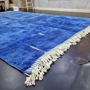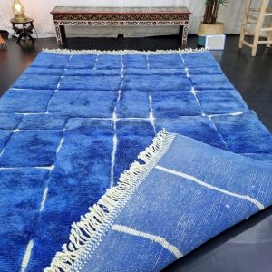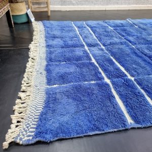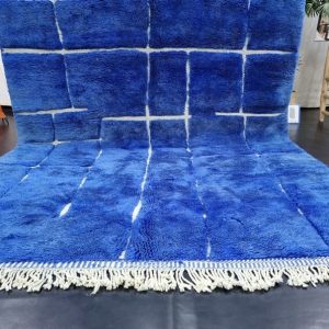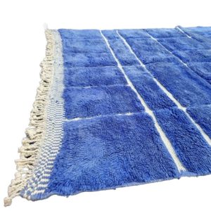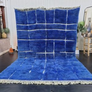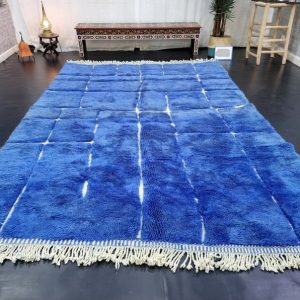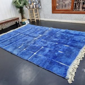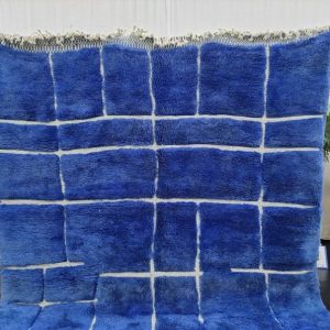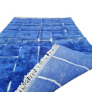 Artistic Blue Soft Chekered Handmade Rug, with engraved geometric pattern. Handwoven by local tribal Berber Women weavers in the Atlas Mountains in Morocco.